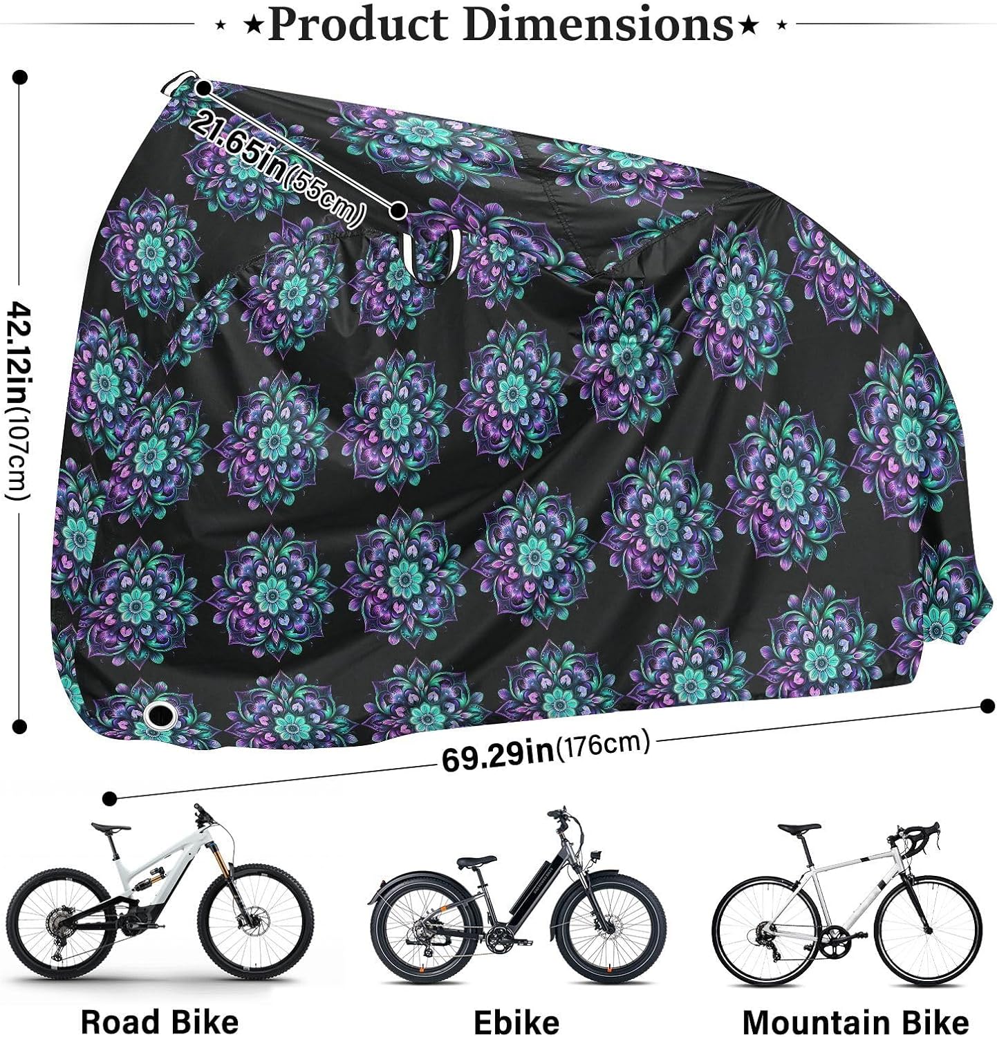 Protect your bicycle in style with our premium bike tarp, engineered for maximum defense against harsh elements. Unlike basic covers, we use specially engineered umbrella waterproof fabric - the same advanced material used in high-end rain umbrellas - delivering superior performance with unique visual appeal. Sun & Heat Defense Our fabric creates a physical cooling barrier that actively lowers your bike's temperature by: Blocking 95%+ harmful UV rays to prevent paint fading Providing exceptional shading & heat insulation (up to 20℉/11℃ reduction vs direct sun) Offering SPF 50+ equivalent protection for sensitive components Rain & Dust Protection Water-repellent coating causes rain to bead and roll off Tightly woven fabric acts as dustproof barrier for long-term storage Prevents moisture buildup with breathable side panels (prevents condensation) User-Focused Design LOCK ACCESS HOLE at front wheel enables secure locking without removing cover ADJUSTABLE BUCKLE STRAP at rear wheel anchors cover during strong winds Reflective safety strips on handles enhance nighttime visibility Ultra-lightweight (23 oz) folds into included pouch Unbeatable Aesthetics Choose from over 1,000 designer patterns - from sleek geometrics to vibrant nature motifs - transforming your bike into a street-style statement while competitors offer only solid colors.