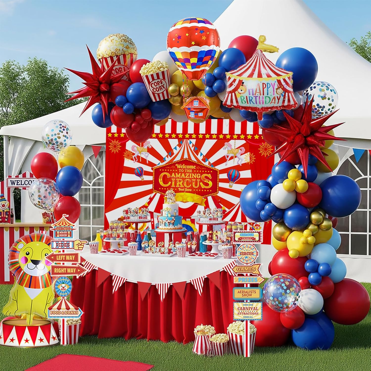 Step right up to the most spectacular party in town! Our Circus Carnival Balloon Decoration Set transforms any space into a vibrant big top. Featuring a dazzling array of royal blue, yellow, red, white, light blue, and gold balloons, plus confetti-filled wonders, this set includes eye-catching foil balloons like explosion stars, hot air balloons, and popcorn. The set also comes with a classic red and white striped banner, a festive backdrop, and a carnival circus sign, ensuring a truly immersive experience. What you see is what you get – real photos, real results! With easy-to-follow instructions, your circus adventure awaits!
