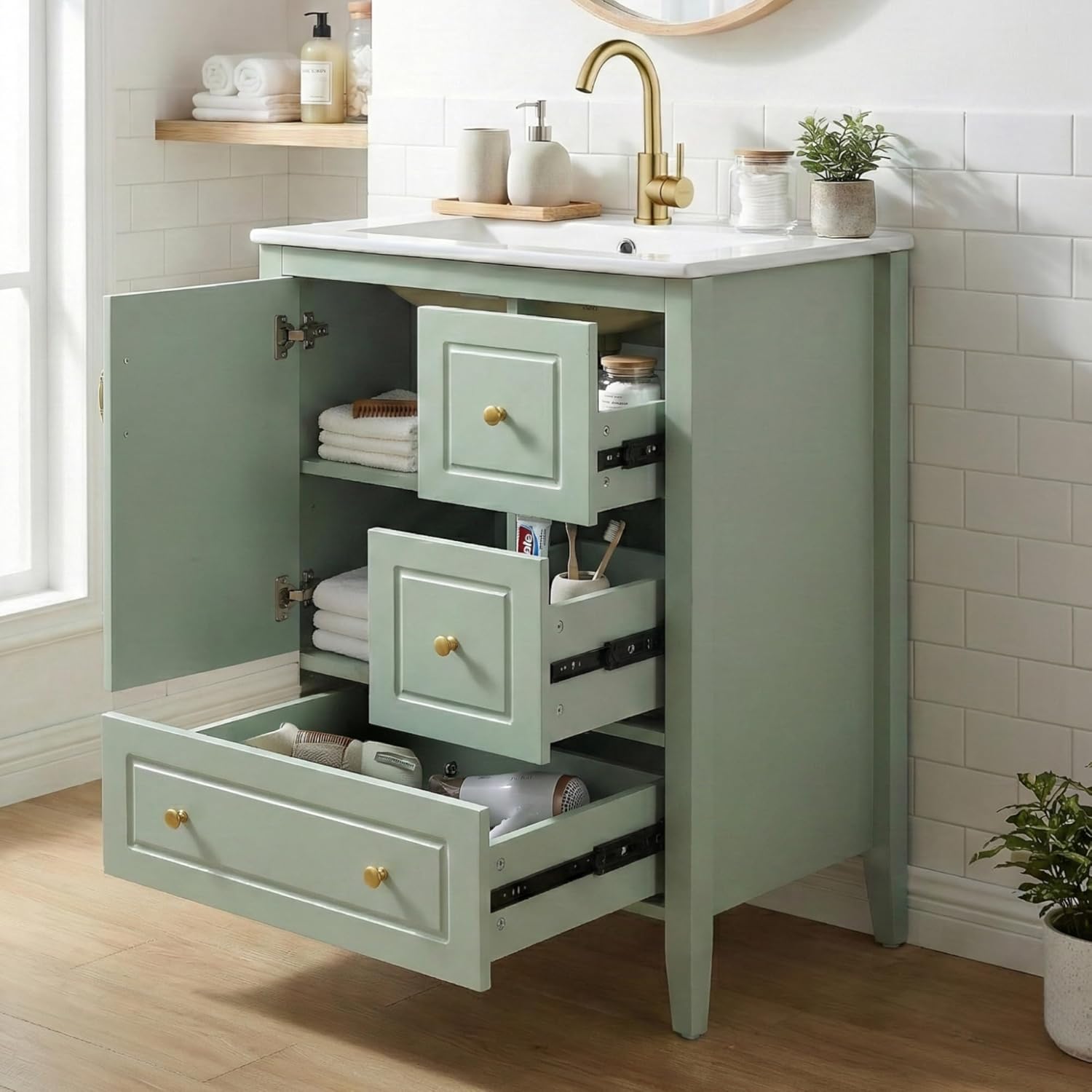 Bullet Point1. 30" Bathroom Vanity with Sink2. Rubber Wood & MDF & Ceramic & Painted Finish3. Cabinet with Door Shelf & 3 Drawers4. One PackageDetails1. Soft Closing Door & Door Stopper2. Gold Knobs3. Metal Hinges & Slide RailsMaterialHigh-quality MDF BoardSolid Wood FramePainted FinishMetal HandlesCeramic SinkPre-drilled Three Faucet HolesChrome-finish OverflowCompatible with 4" Centercet Faucet (not included)Freestanding Bathroom VanitySoft Closing DoorBack OpenEasy Access for PlumbingStorage SpaceCabinet with Door Organizer3 Drawers in Different SizesShampoo/Towels/Soaps/Body LotionProduct Dimensions & WeightsOverall Product 30"L x 18.3"W x 33.7"HCabinet Base 29.4"L x 18"W x 33"HSink Top 30"L x 18.3"W x 4.3"H (28lbs)More InformationShape RectangularFinish Painted FinishMounting Type FreestandingNumber of Sinks Accommodated 1Sink Type Undermount; Drop-InSink Location CenterVanity Top Edge Type FlatEdge Thickness 0.7"Faucet Mount 4"(not included)Hardware Included YesCapacity 100lbsBacksplash/Sidesplash Included NoNumber of Doors 1Number of Drawers 3Assembly Assembly Required