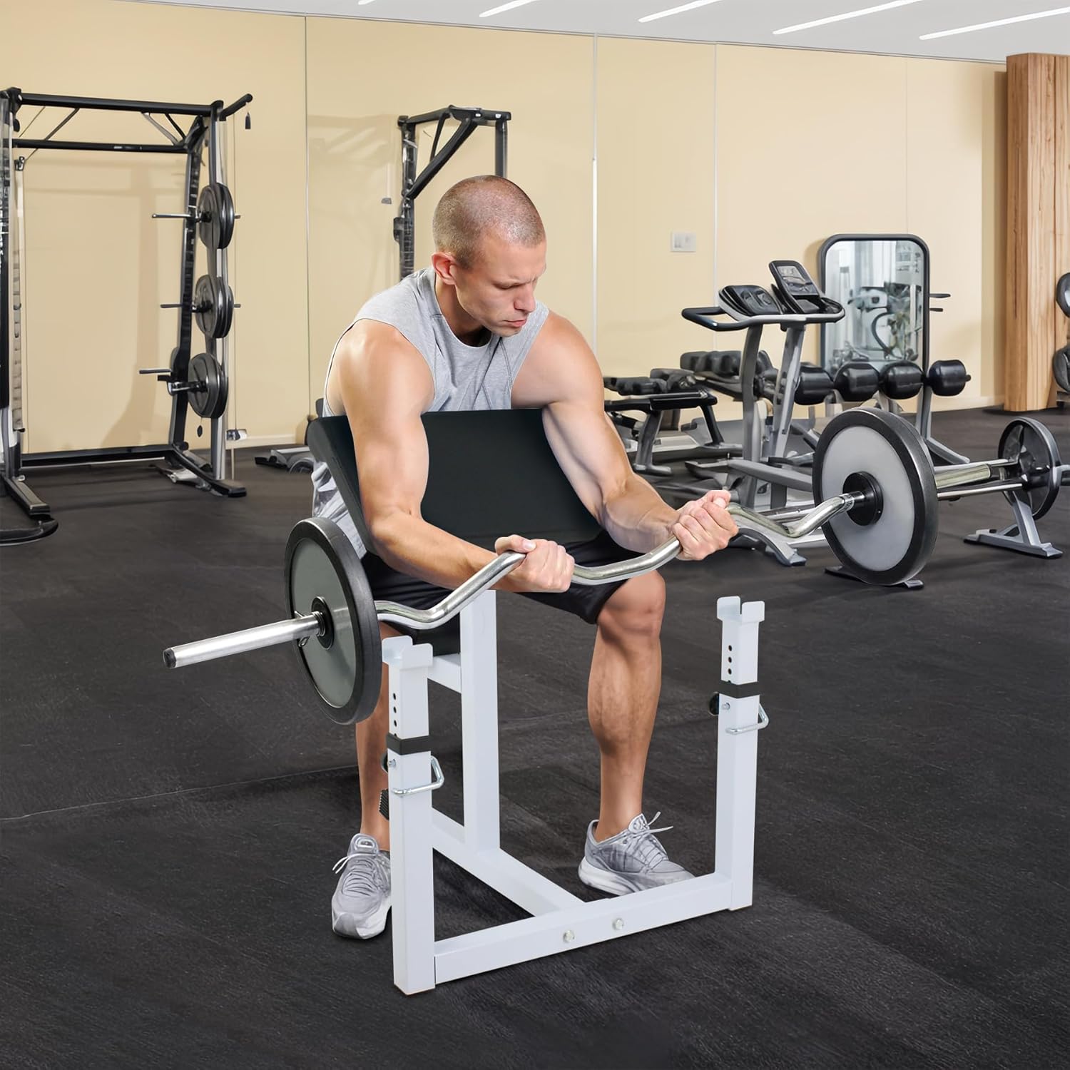 Get ready to pump up your biceps with JungleA preacher curl bench!Specifications: Weight: 31 lbs Load capacity: 550 lbs Pad thickness : 2" Size of the Pad:13.98 x 9.45 x 1.89inch Whole Size: 28.54"(L) x 27.17"(W) x 31.1-35"(H) Bar rest adjustment: 18" - 22"(H) Arm rest adjustment: Six-position 31" - 35"(H) Package include: 1 x Arm curl bench (need assembled) Note: 1.Dumbbells and barbell are not included. 2.Simple Assembly is required according to the included instruction. 3.Please check the weight capacity before using dumbbells or barbell.