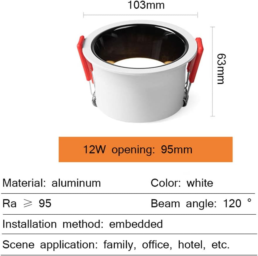 Product Description1. Compared with fluorescent lamps/halogen lamps/incandescent lamps, it can save energy by 45-70%, and has a long service life: >90000H.2. Healthy and flicker-free, eye protection, quick activation.3. Built-in high-power LED driver, imported cob chip, good heat dissipation and low light decay.Product Type: Concert / Spotlight Ceiling / Recessed Ceiling Spotlight / Recessed TiltFixed color: white+blackMaterial: aluminum + PCSize information: (you can refer to the size chart)Power: 7W, 10W, 12W, 15W7W: outer diameter 83mm, height: 50mm, ceiling opening size: 75mm10W: outer diameter 83mm, height: 50mm, ceiling opening size: 75mm12W: outer diameter: 103mm, height: 63mm, ceiling opening size: 95mm15W: outer diameter: 123mm, height: 74mm, ceiling opening size: 115mmColor temperature: 3000K, 3500K, 4000K, 6000K optionalColor rendering index: Ra≥95Bulb Type: LEDNumber of light sources: 1Voltage: 110V-240VWhether to use light bulbs: YesIrradiation area: 10㎡15㎡Specific Uses: Perfect Ideal for Study, Hallway, Dining Room, Storage Room, Bedroom, Living Room, Hallway, Exhibition Hall, Balcony, Hotel Room.Package includes:Downlight*2Mounting Accessoriesnotes:1. Please make sure the power has been cut off before installation.