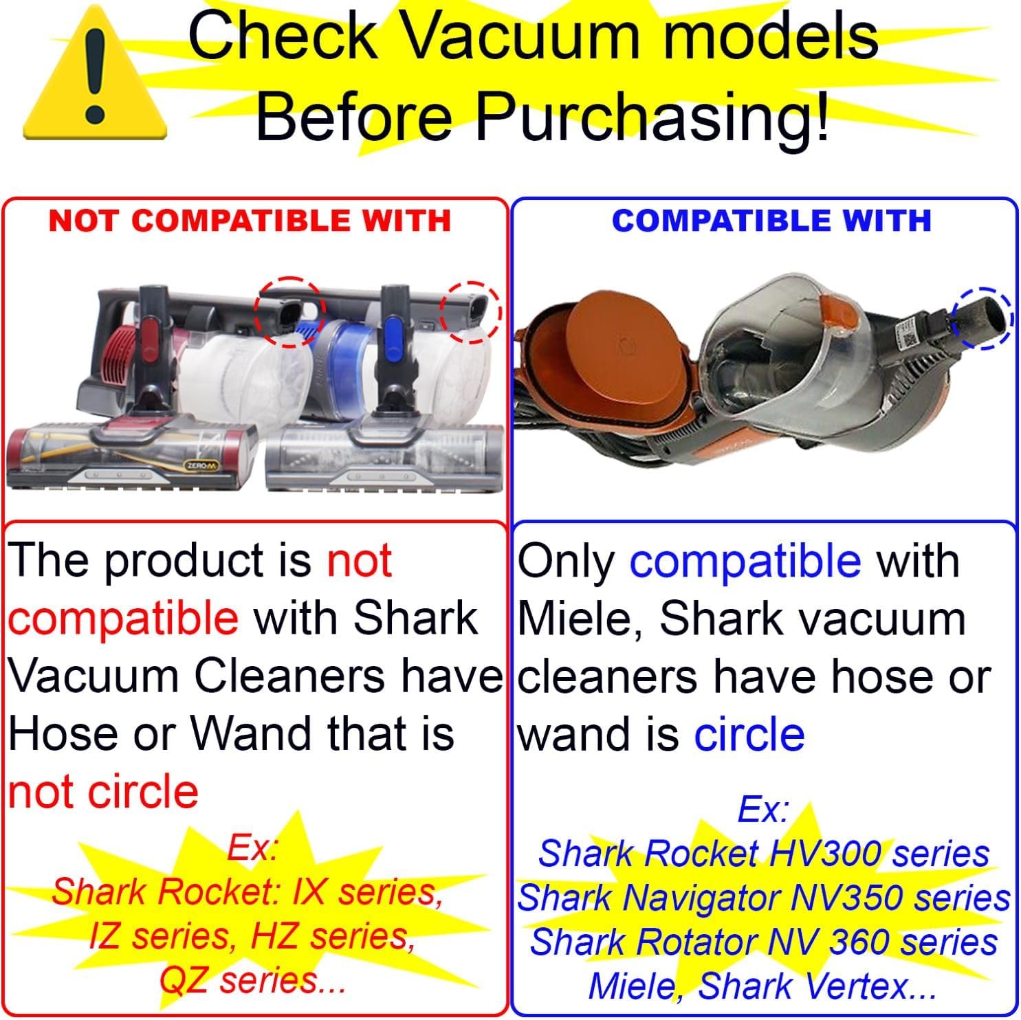 -High Quality Product: Vacuum attachments are made of high-grade ABS plastic with a smooth surfaceInclude 1* Duster Brush, 1* Crevice Tool and 2* Adapter Compatible with Miele C1 C2 C3 & Shark vacuums.-Compatible with Shark Navigator Lift-Away Vacuum Cleaner Models NV350, NV352, NV355, NV356E, Shark NV500 series: Can connect directly or using adapter.-Compatible with Shark Rocket HV300 HV301 HV322 HV320 HV340, Rotator NV600 NV650 NV680 NV681 NV800 NV801 NV803 NV480 series Vacuum Cleaner: using adapter.-Compatible with Shark Rotator Professional Lift-Away Upright Vacuums NV500, NV501, NV502, NV503, NV504, NV505, NV510, NV520 series: Can connect directly or using adapter.-Universal 35MM (1.37 INCH) (1-3/8'') Vacuum Attachments: With Adapter, this vacuum accessories and attachments kit can fit MOST vacuum cleaners using inner 1-3/8'' (35mm) accessories